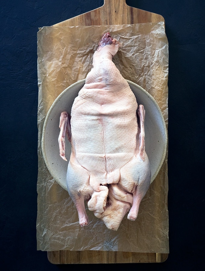 Pour vous orienter, placez le canard devant vous : le cou vers le haut, l’arrière vers le bas. Les poitrines sont charnues à l’avant, l’arrière est plus osseux. Posez-le côté poitrine vers le haut, prêt à être travaillé.
